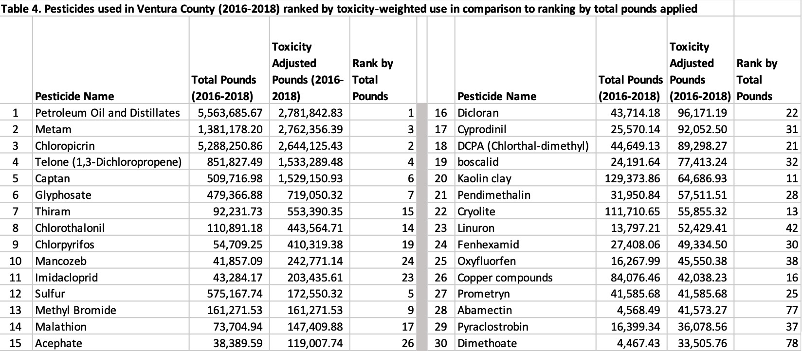 The study found that 17.1 million pounds of pesticides, or an average of 5.7 million pounds per year, were sprayed in Ventura County from 2016 to 2018. The pesticides used included more than 60 types known to be carcinogenic and 74 types linked to endocrine disruption. Another 85 pesticides used in the county were linked to developmental and reproductive toxicity.
