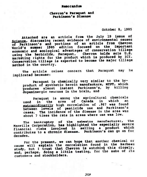 In October 1985, an internal memorandum circulated to top Chevron officials noted that a study by a Canadian researcher had found “an extraordinarily high correlation” between Parkinson’s and the use of pesticides, including paraquat. The memo also noted that paraquat was ‘chemically very similar” to the byproduct of synthetic heroin called MTPT, “which produces almost instant Parkinson’s, by killing dopaminergic neurons in the brain.”