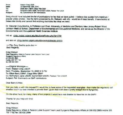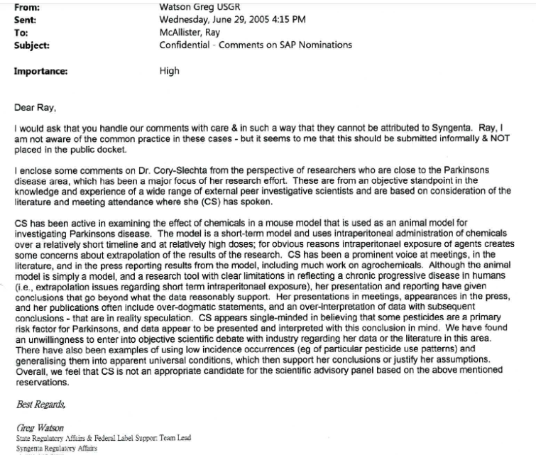“I would ask that you handle our comments with care & in such a way that they cannot be attributed to Syngenta,” Greg Watson, a Syngenta regulatory affairs executive, wrote to McAllister. He then suggested that the communications to the EPA about Cory-Slechta “should be submitted informally & NOT placed in the public docket.”
