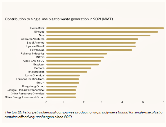 The report updates a previous analysis of single-use plastic waste released by Minderoo Foundation in 2021, which identified for the first time the 20 largest petrochemical companies that are the sources for much of the world’s single-use plastic production. According to the new report, ExxonMobil leads the pack, followed by Chinese petrochemical giant Sinopec, and then Dow.