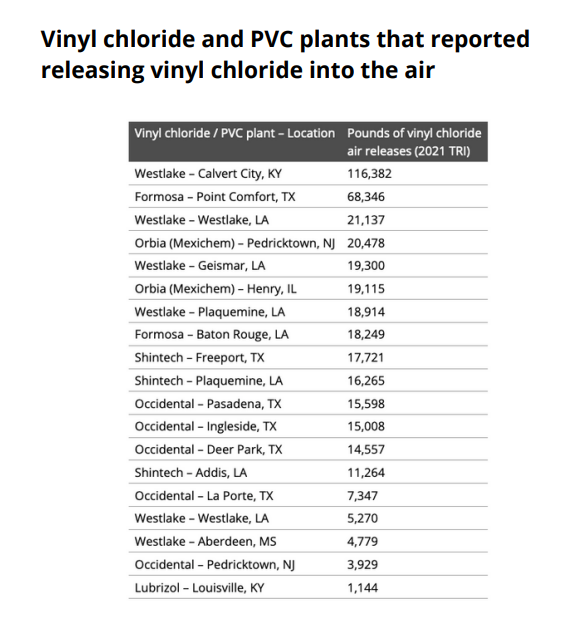 Occidental Chemical and Shintech, manufacturers of vinyl chloride and PVC plastic that burned in the East Palestine train derailment, together generated nearly 105,000 pounds of vinyl chloride air pollution in 2021.