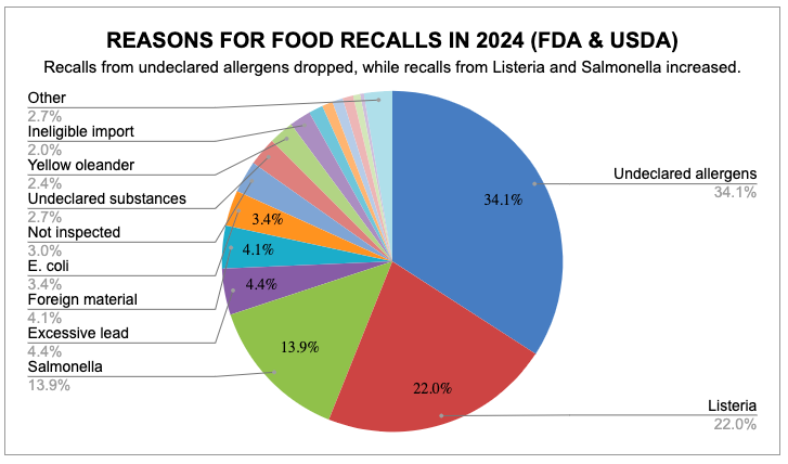 Recalls for undeclared allergens in foods accounted for more than a third of all recalls last year, though they dropped to 101 in 2024 from 154 in 2023.