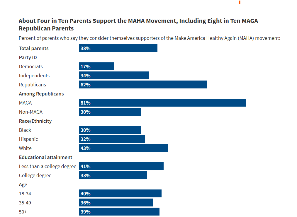 A recent poll by KFF, formerly the Kaiser Family Foundation, shows roughly four in ten White US parents say they are MAHA supporters, while roughly three in ten Hispanic and Black parents say they align with the movement. The strongest support came from Republicans, though 34% of voters identifying as Independents and 17% of Democrats support MAHA, according to the poll.